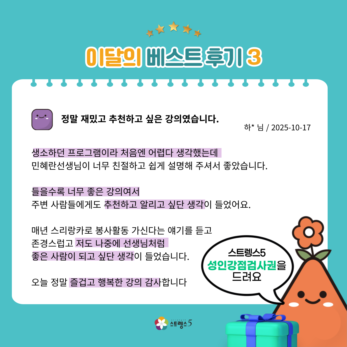 2025년 10월 베스트 리뷰 당첨자 안내 드립니다.당첨되신 회원분들께는 문자로 개별 안내드렸습니다🤲🏻잊지말고 꼭 쿠폰 사용해 주세요💗베스트 리뷰 이벤트 계속됩니다✨2025년 11월에도 많은 참여 부탁드려요:)✅당첨자 안내