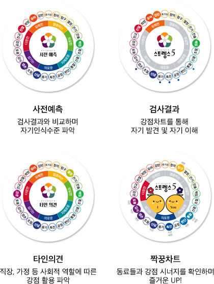 - 강점차트 : 대표강점, 후보강점, 강점발현유형 등 검사결과를 한 눈에 확인할 수 있는 나만의 고유한 강점차트가 생겨요.